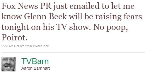 10-14-2009 AARON BARNHART'S CREDIBILITY CHALLENGED BY FOX NEWS OVER ALLEGED 'TWEET' The Kansas City Star's TV critic Aaron Barnhart, who refers to himself as a "professional blogger" compared to virtually all other bloggers, may have been caught stretching the truth by 'tweeting' that Fox News had 'tweeted' him a tip that Glenn Beck was going "to be raising fears on his show tonight." The Huffington Post then quoted Barnhart and then MSNBC's Keith Olbermann ran with Barnhart's tweet and used it to blast Beck (right). Unfortunately for Barnhart's credibility, Fox News has flatly denied it ever sent that message him. In fact the Fox people are telling him to either put up or shut up. �... unless he (Barnhart) produces the alleged email from the Fox News PR department, it is safe to assume he was caught making things up,� Fox told the Web site Mediaite, which has done a complete article on the controversy. Mediaite has said Barnhart has refused to respond to repeated emails and phone calls, "So we don�t know the truth here, only that he hasn�t fully explained why he�d tweet something that he claims came from the PR department at Fox but refuses to back that claim up with proof, now that Fox is denying it." According to Mediaite, "Barnhart, who is, ironically, on the board of the Television Critics Association, has since called his tweet a �smartass comment,� implying that he may have exaggerated or sensationalized the words of his Fox News contact, fooling Olbermann in the process."