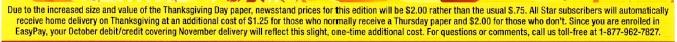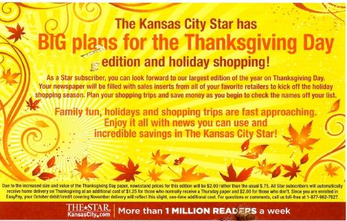 Just another example of why, just for sheer goodwill (to say nothing of being thankful for the subscribers that remain) The Star should have kept the standard daily rate (if there is one) for their Thanksgiving Day edition instead of trying to �double dip�. This also excludes Automotive and Real Estate.